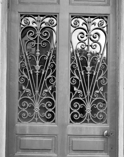 Vue de détail de la ferronnerie à motif végétal de la porte d'entrée à l'ouest.Immatriculation