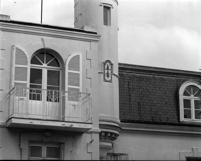 Elévation sud, détail de la tourelle et de la céramique représentant une hermine.Immatriculation