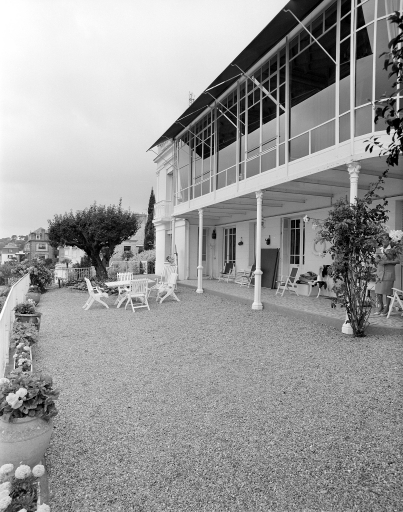 Vue générale de la terrasse avec colonne en fonte.Immatriculation