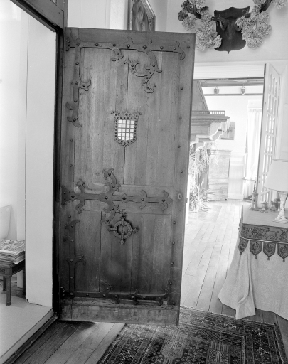 Vue générale d'une porte intérieure sculptée, ancien couloir, rez-de-chaussée.Immatriculation