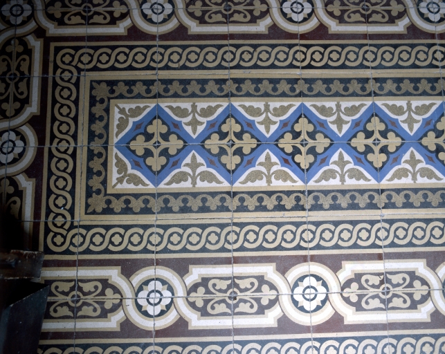Détail des carreaux de terre cuite dans le vestibule.Immatriculation