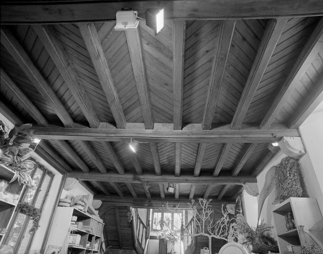 Vue générale du lambris et poutres du plafond.Immatriculation