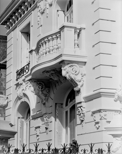 Vue générale du balcon du 1er étage à balustres.Immatriculation