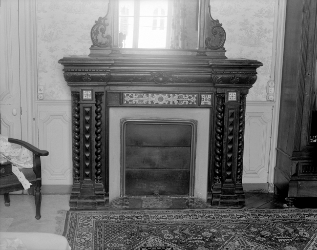 Vue générale de la cheminée en bois avec linteau en céramique dans la salle à manger.Immatriculation