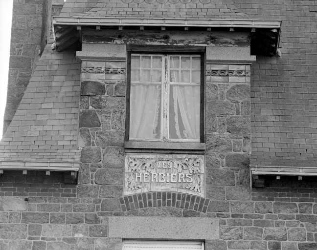 Saint-Malo. Villa Les Herbiers, 72 chaussée du Sillon, élévation nord : détail du cartouche en grès flammé.Immatriculation