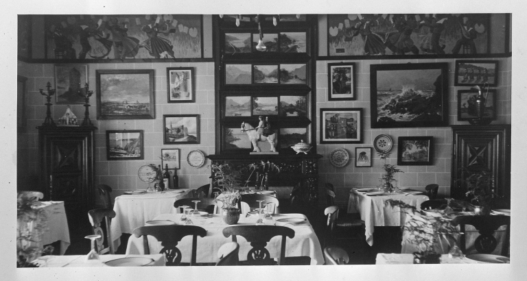 Salle de restaurant de l'hôtel, vue partielle avec cheminée, après l'aménagement du décor de Sévellec.Immatriculation