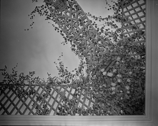 Détail angle du plafond sculpté dans le salon.Immatriculation