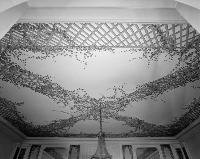 Vue générale du plafons sculpté dans le salon.Immatriculation