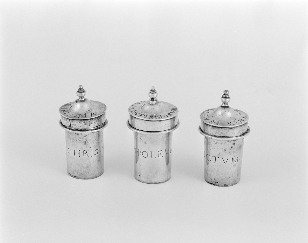Ampoule à huile des catéchumènes (boîte à huile sainte), ampoule à saint chrême (boîte à saint chrême), ampoule à huile des malades (boîte à huile des malades), église paroissiale Saint-Michel (Île-aux-Moines),