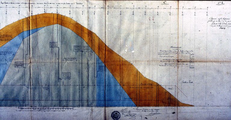 Département du Morbihan. Profil en longueur du bief de partage d'Hilvern. Dessin, par Lenglier, ingénieur en chef des Ponts et Chaussées, le 31 mars 1825 ; échelle : 1 : 50.