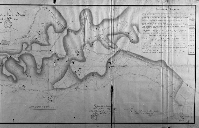 Carte de la portion du canal de Nantes à Brest qui serait comprise entre Pontivy et Hilvern (15 décembre 1825) : partie droite de la carte (DDE Morbihan, Pontivy)Immatriculation