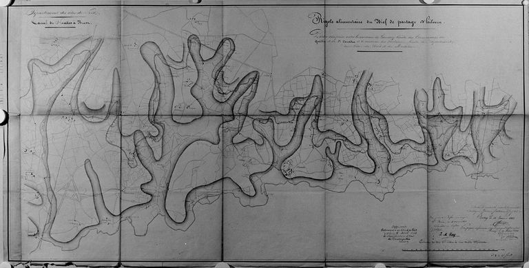 Tracé de la rigole entre le ruisseau de Guernay et le ruisseau des Fontaines, 22 janvier 1844 : vue générale de la carte 2 (D. D. E. Morbihan, Pontivy)Immatriculation