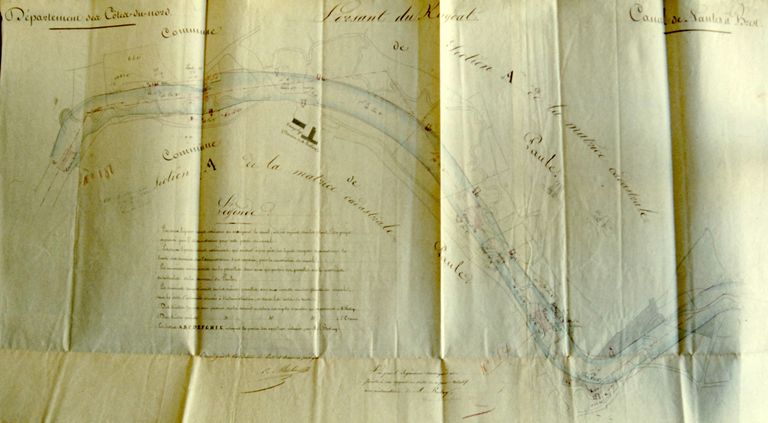 Département des Côtes-du-Nord. Canal de Nantes à Brest. Versant du Kergoat. Projet du canal entre Keriffaut et le pont de St-Eloi. Dessin, 2 feuilles, [s. n. ; s. d.]. Papier, encre, aquarelle, 40x65,5.