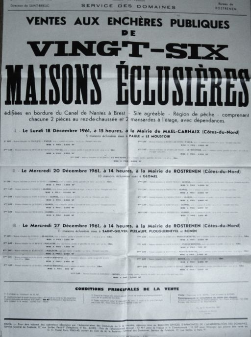 Vente aux enchères publiques de 26 maisons éclusières [situées dans les Côtes-du-Nord]. Affiche, 1961.