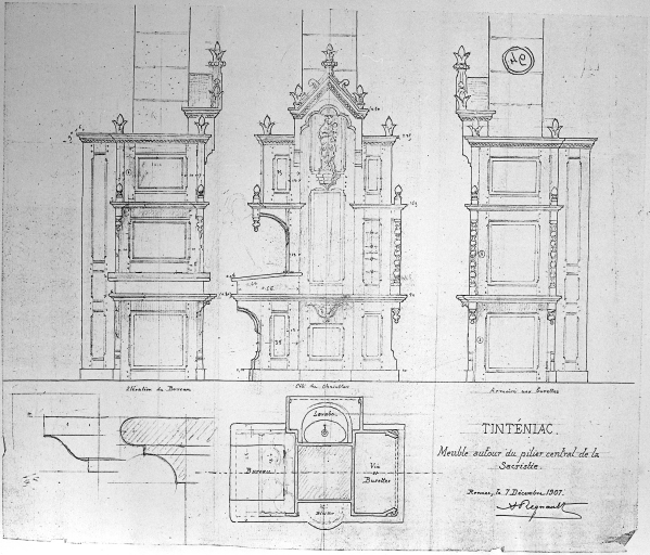 Plan du meuble, élévation de celui-ci du côté du chasublier, élévations du bureau et de l'armoire à burettesImmatriculation
