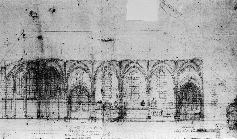 Plan, autre projet (sacristie principale déplacée du sud au Nord de l'édifice) et coupe de la façade latérale.Immatriculation