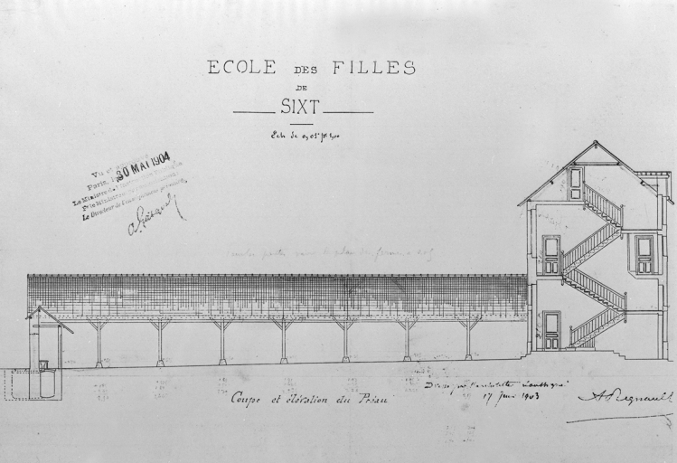 Plan dressé le 17 juin 1903 par l'architecte Arthur Regnault : coupe et élévation du préauImmatriculation