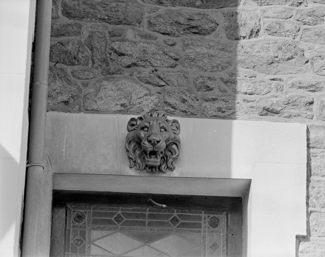 Saint-Malo. Maison, 9 avenue John Kennedy, décor à tête de lion en céramique au dessus de la porte.Immatriculation
