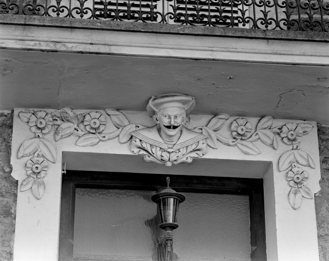 Paramé. Maison, 3 passage de Rochebonne, détail de décor en stuc à tête de marin sur le linteau de porte.Immatriculation