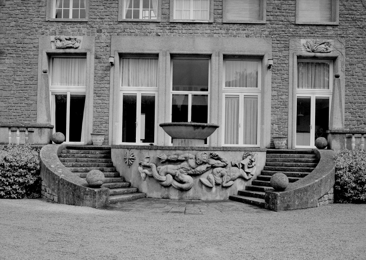 Détail de l'avancée sculptée sur jardin.Immatriculation