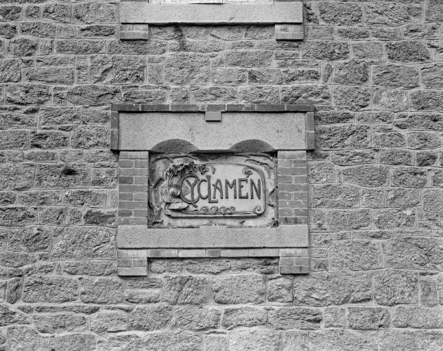 Céramique du bow-window, inscription Cyclamen, façade latérale.Immatriculation