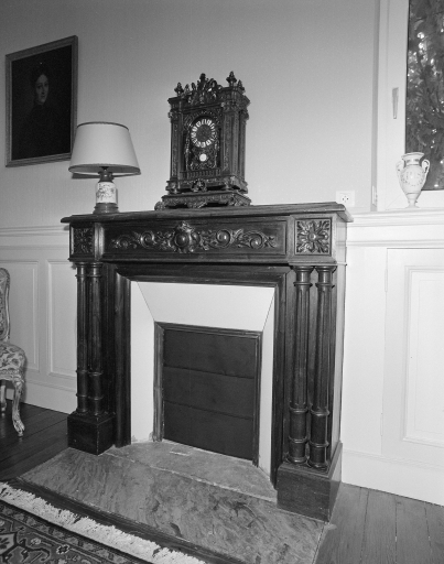 Vue générale de la cheminée en bois sculpté dans le salon.Immatriculation