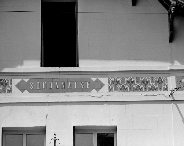 Elévation sud-est, détail de la mosaïque avec inscription La Soudanaise.Immatriculation