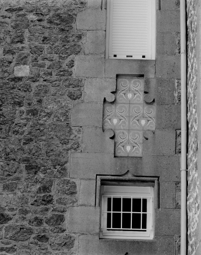 Façade ouest, partie gauche, détail céramique et mouluration de baie (tour centrale, pavillon à l'intérieur des trilobes).Immatriculation