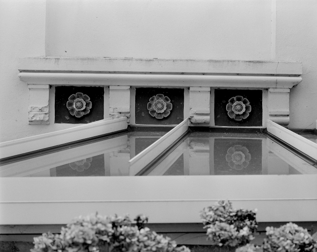Le Petit Roc, détail céramique extérieure sous le toit.Immatriculation