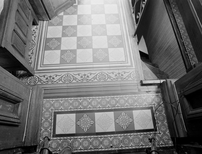 Le Petit Roc, pavement de céramique intérieur, détail.Immatriculation