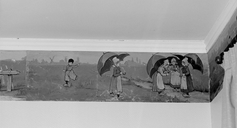 Salle à manger, décor toile peinte, décor hollandais avec personnages femmes et parapluies.Immatriculation