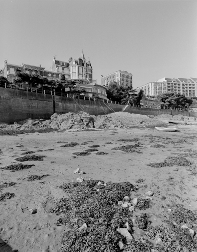 Vue générale de la plage avec le grand hôtel.Immatriculation