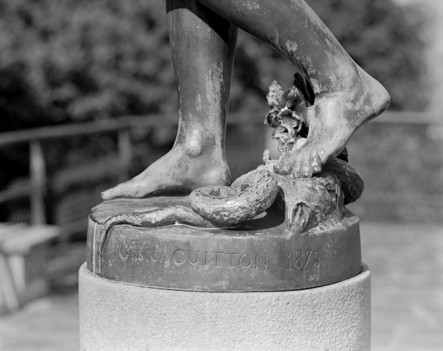 Terrasse extérieure, statue, détail signature et date sur le socle.Immatriculation
