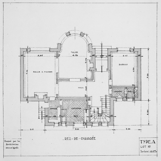 Projet de villa, type A, plan du rez-de-chaussée.Immatriculation