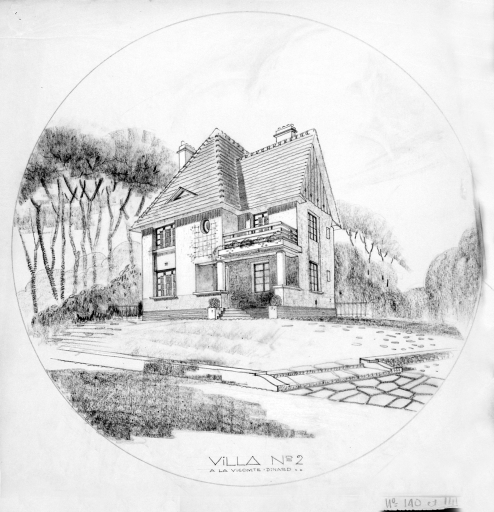 Projet de villa n°2, n°140 et 141, élévation de façade, perspective.Immatriculation