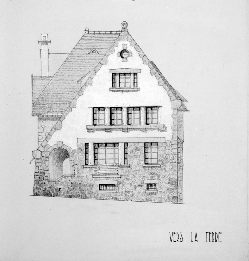 Projet de villa n°2/150, élévation de façade vers la terre.Immatriculation