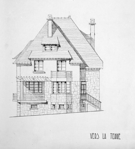 Projet de villa n°2, élévation de façade vers la terre.Immatriculation