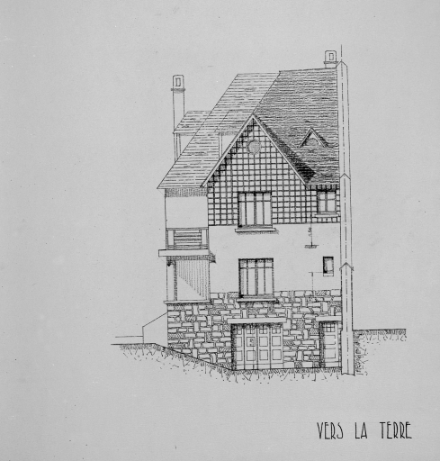 Projet de villa n°9 et 10, élévation de façade vers la terre.Immatriculation