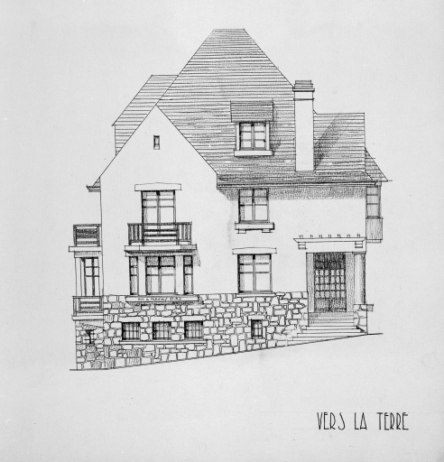 Projet de villa n°5, lot 11, élévation de façade vers la terre.Immatriculation