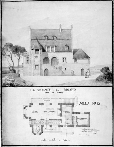 Projet de villa n°13, élévation sur mer, plan du rez-de-chaussée.Immatriculation