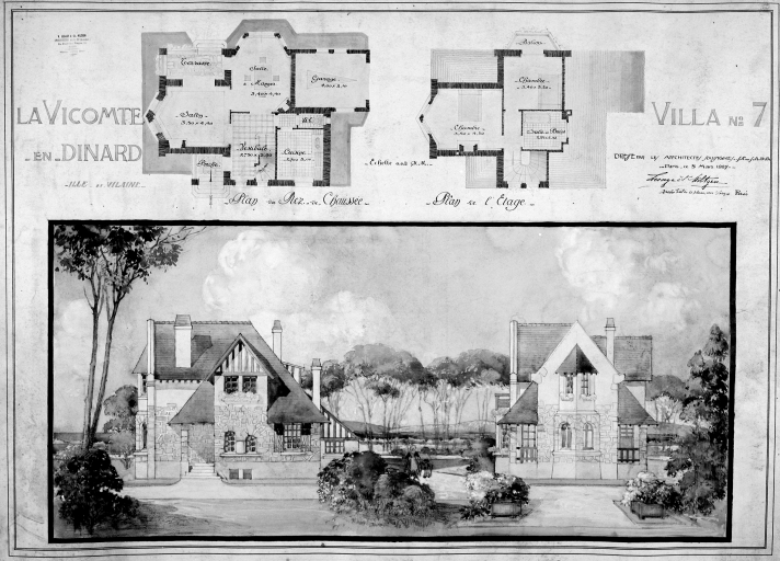 Projet de villa, n°7, lot 23, élévation sur mer, élévation sur jardin, plan du rez-de-chaussée, plan de l'étage.Immatriculation