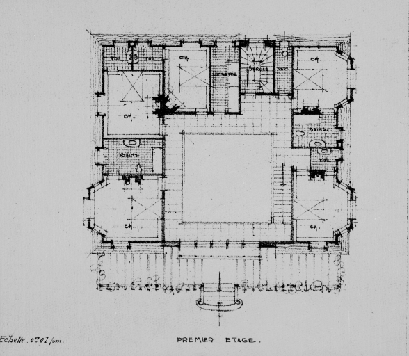 Projet de villa du type C, hall à l'anglaise, plan du 1er étage.Immatriculation