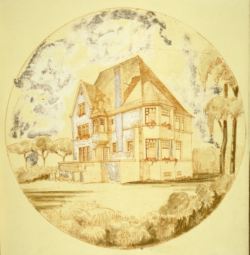 Projet de villa n°4, perspective, élévation de façade principale.Immatriculation