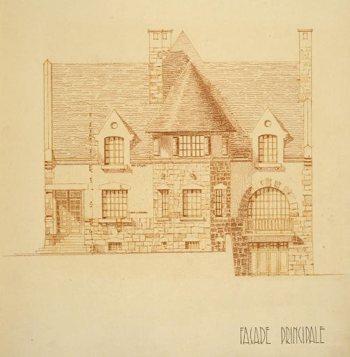 Projet de villa, variation du type A, élévation, façade principale.Immatriculation
