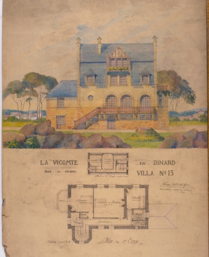 Projet de villa n°13, élévation principale, plan du 1er étage, plan du 2ème étage.Immatriculation