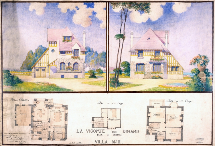 Projet de villa n°11, élévation sur mer, élévation sur jardin, plan du rez-de-chaussée, plan du 1er étage, plan du 2ème étage.Immatriculation