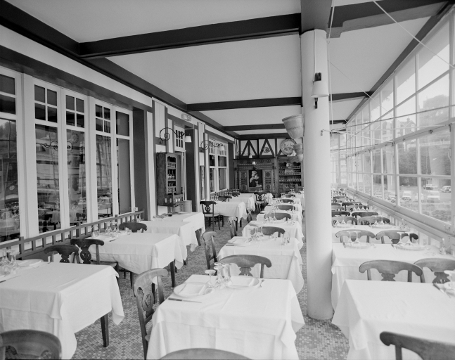 Vue générale de la terrasse qui suit le restaurant au 1er niveau.Immatriculation