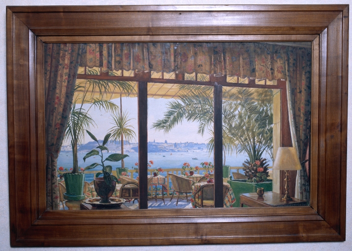 Vue générale de la terrasse de l'hôtel et vue sur mer.Immatriculation