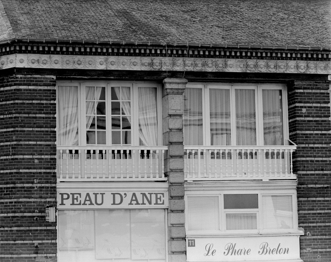 Détail vitrine du magasin Peau d'Âne et détail céramique sous toiture de l'immeuble.Immatriculation
