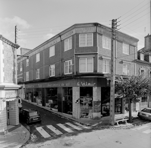 Vue générale de 3/4 ancien bâtiment Bailly, actuellement magasin de commerce G. Vilair.Immatriculation